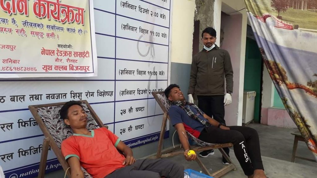 रौतहट ११ मंसिर / बिजयपुरमा शनिवार रक्तदान कार्यक्रमको आयोजना गरीएको छ । शनिवार भएको सो रक्तदान कार्यक्रम २२ जनाले रक्तदान गरेका छन । नेशनल हस्पिटल बिजयपुर र बिजयपुर युवा क्लब,बिजयपुरको आयोजनमा फतुवाबिजयपुर नपाको बिजयपुर बजारमा अस्पतालको संचालक समितिको अध्यक्ष मणिभूषन यादवको अध्यक्षता तथा नेपाल रेडक्रस रौतहट जिल्ला शाखाका मन्त्री धर्मेन्द्र प्रसाद सिह को प्रमुख अतिथ्यतामा रक्तदान कार्यक्रम सम्पन्न भएको हो ।