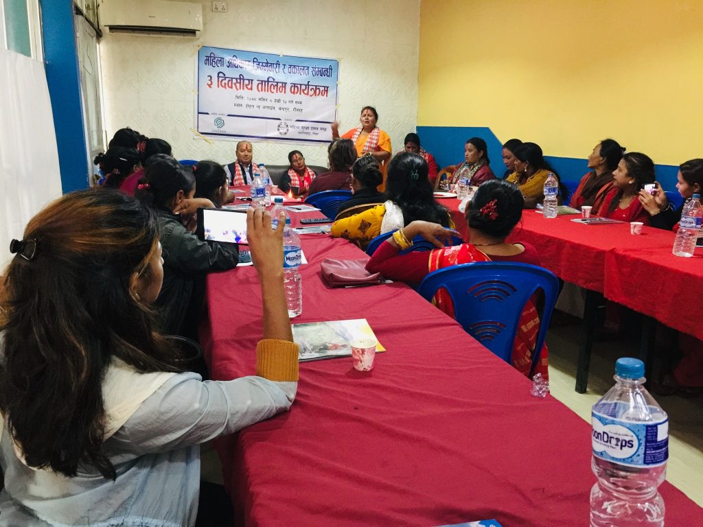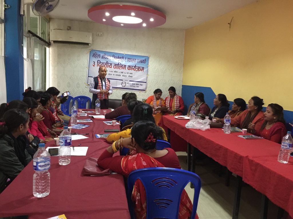मुकेश कुमार साह, रौतहट ८ मंसिर । रौतहटको चन्द्रपुरमा महिला अधिकार जिम्मेवारी र वकालत बिषयमा तिन दिवसीय तालिम सुरु भएको छ । महिला सुरक्षा दवाव समुहको आयोजना तथा टेवाको आर्थिक सहयोगमा तिन दिवसिय तालिम सुरु भएको हो । कार्यक्रमको प्रमुख अतिथि चन्द्रपुर नगरपालिकाका प्रमुख प्रशासकीय अधिकृत सुरेन्द्र प्रधानले पानसमा बती बालेरउद्घाटन गरेका थिए ।