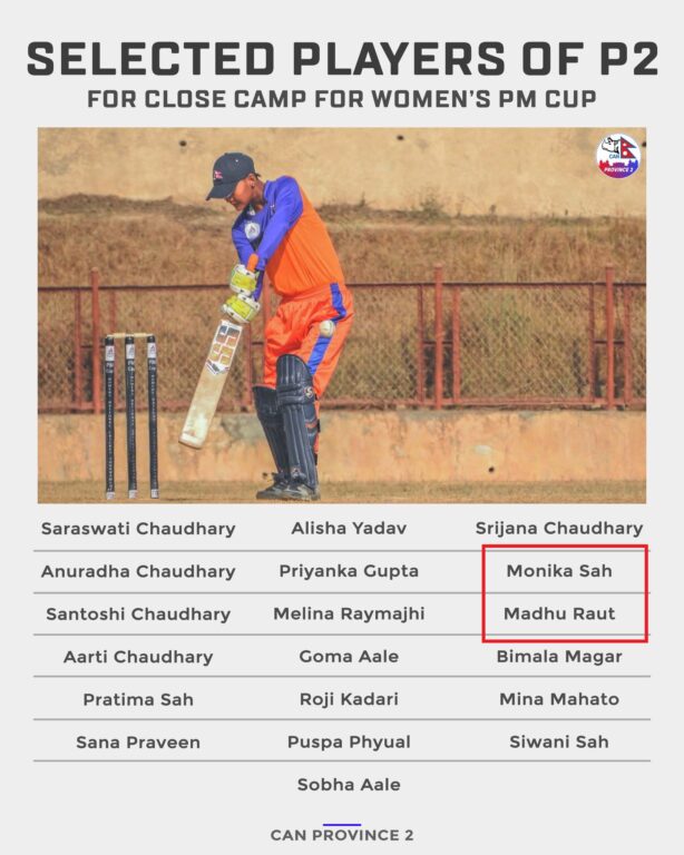 प्रधानमन्त्री कप प्रदेश स्तरिय टि ट्वान्टी महिला सिनियर क्रिकेट प्रतियोगिताको लागी प्रदेश २ बाट २ जना को खेलाडी छनौट गरिएको छ।
