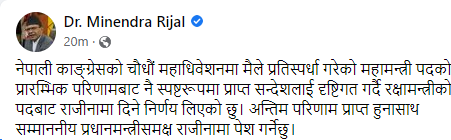 रिजालले कांग्रेसको १४ औँ महाधिवेशनमा महामन्त्री पदको प्रारम्भिक मत परिणाम आएलगतै राजिनामा दिने घोषणा गरेका हुन् ।