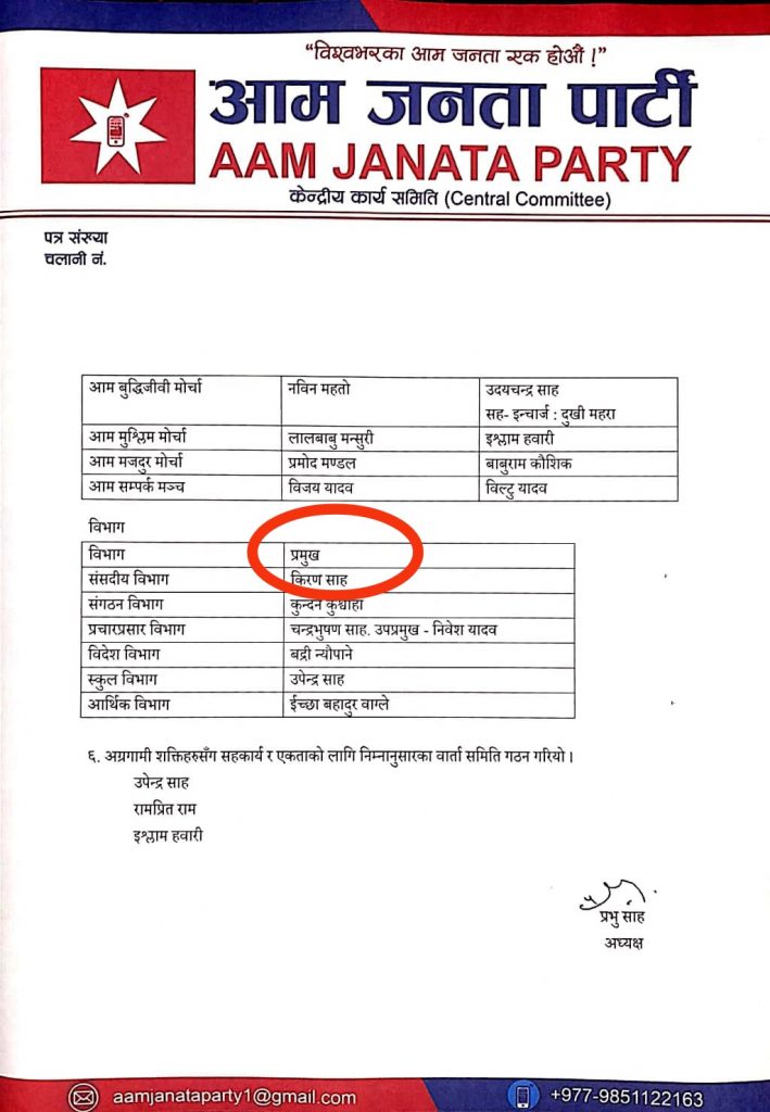 आम जनता पार्टी घोषणा भएको आफुले विभिन्न संचारमाध्यम बाट सुनेको र आफ्नो नाम जोडेर संसदीय बिभाग प्रमुख नियुक्त गरेको सुन्दा अचम्मित भएको सासद साहले बताएका छन ।