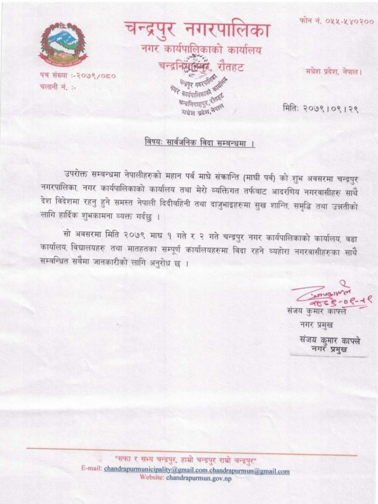 नगरप्रमुख सञ्जय कुमार काफ्लेद्वारा शुक्रबार जारी शुभकामना सन्देश मार्फत माघे संक्रान्तिको अवसरमा माघ १ र २ गते स्थानीय बिदा दिइएको जानकारी गराएका हुन् ।