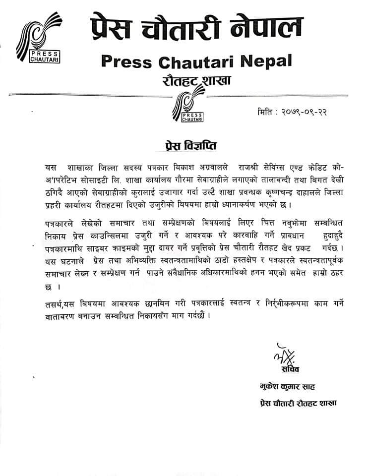 यसै बिच प्रेस चौतारी रौतहट शाखाले बिज्ञप्ति निकालेर पत्रकालाइ सहजरुपमा काम गर्ने बातवरण बनाउन सम्बन्धित पक्ष संग आग्रह गरेको छ ।
