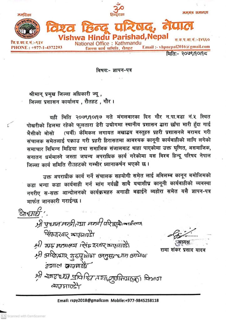 ज्ञापन पत्रमा मंगलवारका दिन गौर न.पा.वडा नं. ५ स्थित पोखरीको डिलमा रहेको फुलतारा डेरी उद्योगमा स्थानीय प्रशासन द्वारा छापा मारी हुँदा गाई भैसीको बोसो , केमिकल लगायत अखाध्य वस्तुहरु प्रहरी प्रशासनले बरामद गरी संचालक समेतलाई पक्राउ गरी प्रहरी हिरासतमा लिएको उक्त घृणित, असमाजिक, सनातन धर्ममास्ने जस्ता जघन्य अपराधिक कार्य गरेकोमा विश्व हिन्दू परिषद नेपाल जिल्ला कार्य समिति रौतहटको गम्भीर ध्यानाकर्षन भएको जनाएको हो।