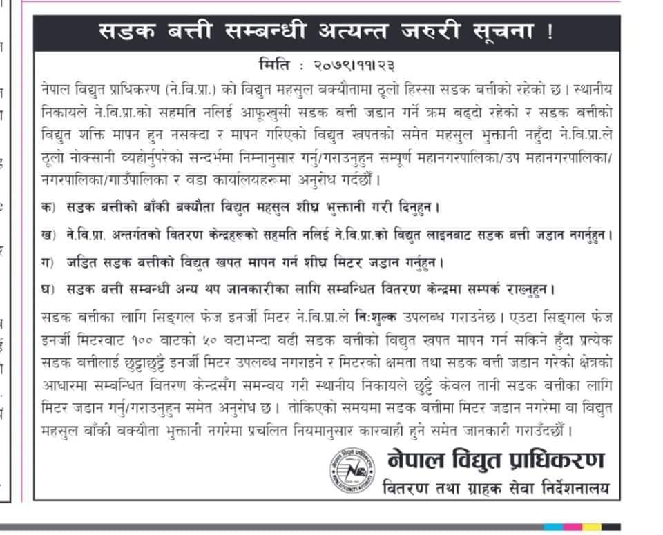 सडक बत्तीमा मिटर जडान नगरेमा वा विद्युत महसुल बाँकी बक्यौता भुक्तानी नगरेमा प्रचलित नियमानुसार कारवाही हुने समेत प्राधिकरणले सुचनामा उल्लेख गरेको छ ।
