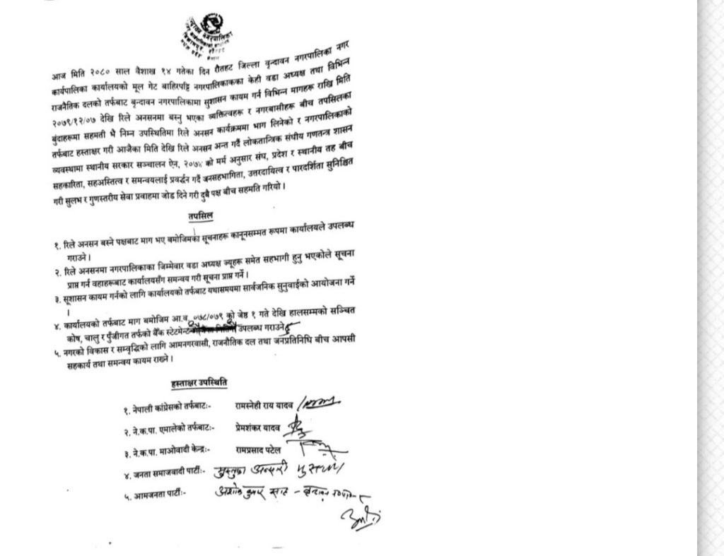 वृन्दावन नगरपालिका प्रमुख प्रशासकीय अधिकृत ओमप्रसाद पाण्डे र अनशनरत पक्षहरूबीच पाँचबुँदे सहमति पनि भएको छ।