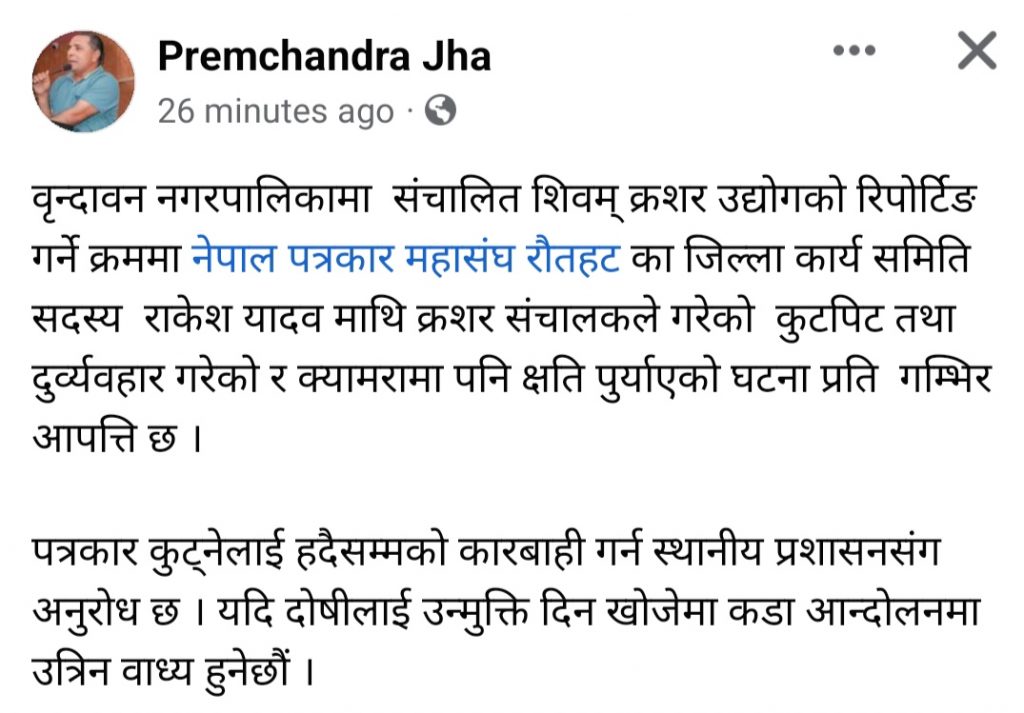 रौतहट शाखाका अध्ययक्ष प्रेमचन्द्र झाले बृन्दावन नगरपालिकामा संचालित शिवम् क्रशर उद्योगको रिपोर्टिङ गर्ने क्रममा नेपाल पत्रकार महासंघ रौतहट का जिल्ला कार्य समिति सदस्य राकेश यादव माथि क्रसर संचालकले गरेको कुटपिट तथा दुर्व्यवहार गरेको र क्यामरामा पनि क्षति पुर्याएको घटना प्रति गम्भिर आपत्ति जनाएका छन ।