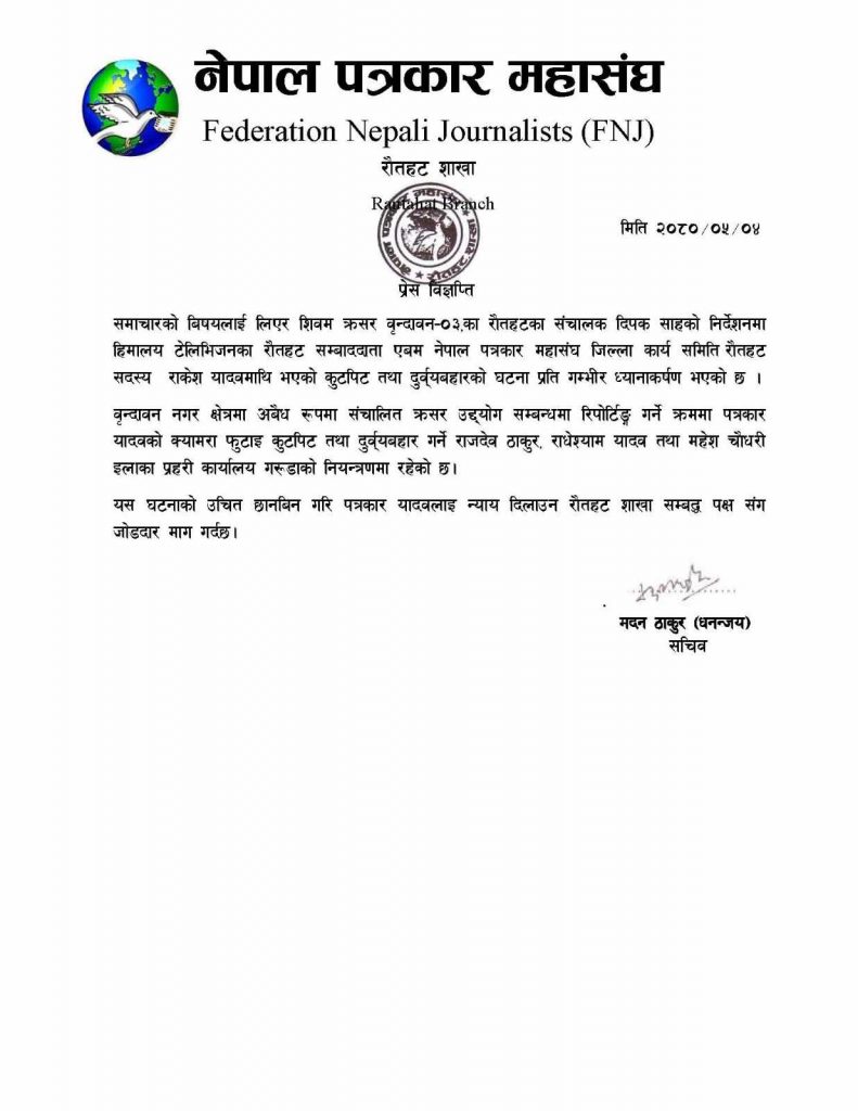 यसै घटनाको देषि लाई कार्वाही र पत्रकार यादवलाई क्षेतिपुर्तीको माग गर्दै रौतहट शाखाले बिज्ञप्ती जारी गरेको छ ।