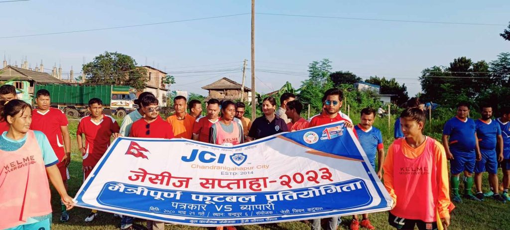 रौतहट २२ भदौ । चन्द्रनिगाहपुर स्थित शेर बहादुर दर्लामी स्मृति खेल मैदानमा विहिबार भएको मैत्रीपुर्ण फुटबल प्रतियोगीतामा पत्रकार समुहको टिम विजयी भएको छ । चन्द्रपुर सिटि जेसिज वर्ष२०२३ को जेसिज सप्ताह अर्न्तगत विहिबार फुटबल प्रतियोगीताको आयोजना गरिएको थियो ।