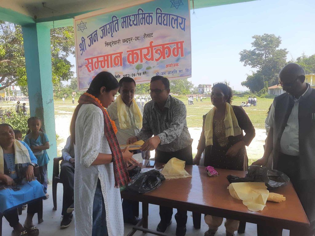 विद्यालय ब्यबस्थापन समिति कार्यवाहक अध्यक्ष उमा चौलागाईंको अध्यक्षतामा भएको सम्मान कार्यक्रममा प्रधानाध्यापक शत्रुघ्न साहले स्वागत मन्तव्य र शिक्षक कृष्ण घिमिरेले संचालन गरेका थिए ।