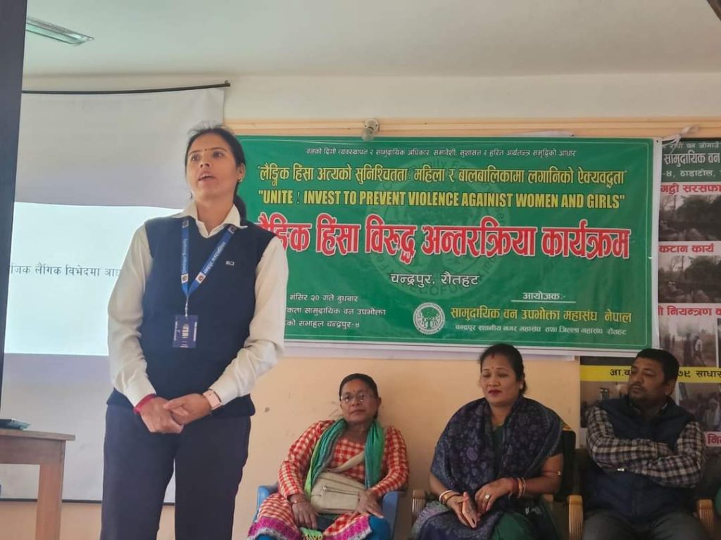 सामुदायिक वन उपभोक्ता समुहहरुको छाता संगठन सामुदायिक वन उपभोक्ता महासंघ नेपाल, जिल्ला महासंघ रौतहट र स्थानीय चन्द्रपुर नगर महासंघको संयुक्त आयोजनामा अन्तर्राष्ट्रिय स्तरमा र नेपालको सन्दर्भमा “लैङ्गिक हिंसा अन्त्यको सुनिश्चितता : महिला र बालबालिकामा लगानीको ऐक्यबद्धता ” भन्ने नाराका साथ लैङ्गिक हिंसा नियन्त्रण सम्बन्धि अन्तरक्रिया कार्यक्रम सम्पन्न भएको छ ।