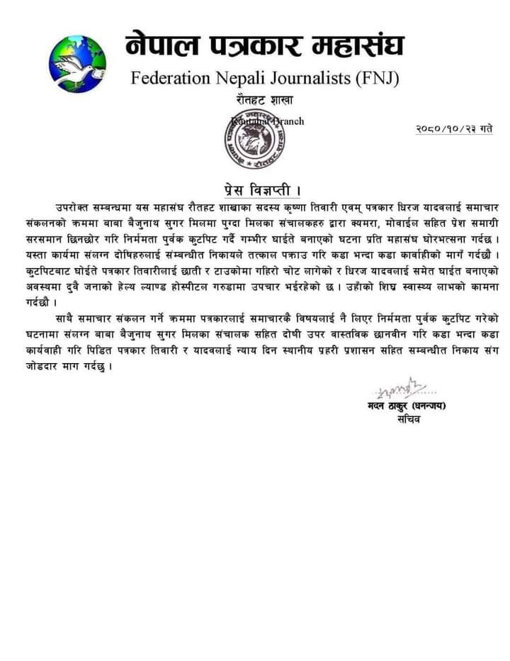 समाजवादी प्रेस संगठन रौतहटले बिज्ञप्ती निकालेर दोषि माथी कडा कार्वाहीको माग गरेको छ ।