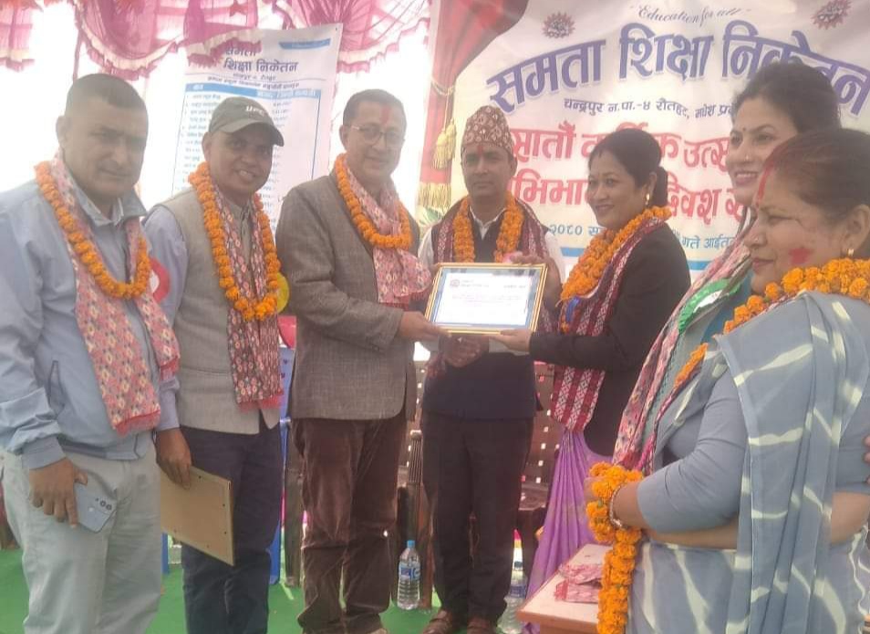 चन्द्रपुर २८ फागुन । समता शिक्षा निकेतन चन्द्रपुर-४ रौतहटको सातौं बार्षिक उत्सव तथा अभिभावक दिवसको उपलक्ष्यमा चन्द्रोदय साकोस लाई सम्मान गरिएको छ ।
