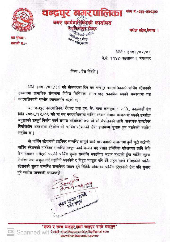 चार्जिंग स्टेशनको हार्डवेयर सम्वन्धि सम्पूर्ण कार्य सम्पन्नताको सम्बन्धमा कुनै त्रुटी नरहेको, चार्जिंग स्टेशनको हार्डवेयर सम्बन्धि सम्पूर्ण कार्य सम्पन्न भए पश्चात प्राविधिक परिक्षणका लागि केहि दिन संचालन गरीएको भएपनि चार्जिंग शुल्क सम्बन्धि सफ्टवेयर जडान नभएको हुँदा चार्जिंग शुल्क निर्धारण तथा अशुल गर्न नसकिने भएकोले र विद्युत महसुल पनि धेरै उठ्न सक्ने देखिएकोले चार्जिंग स्टेशनको शुल्क सम्बन्धि सफ्टवेयर जडान हुने वितिकै अविलम्ब चार्जिंग स्टेशनको सेवा सुचारु हुने चन्द्रपुरका मेयर संजय कुमार काफ्ले ले एक पत्र सार्वजनिक गर्दै जानकारी दिएका छन ।